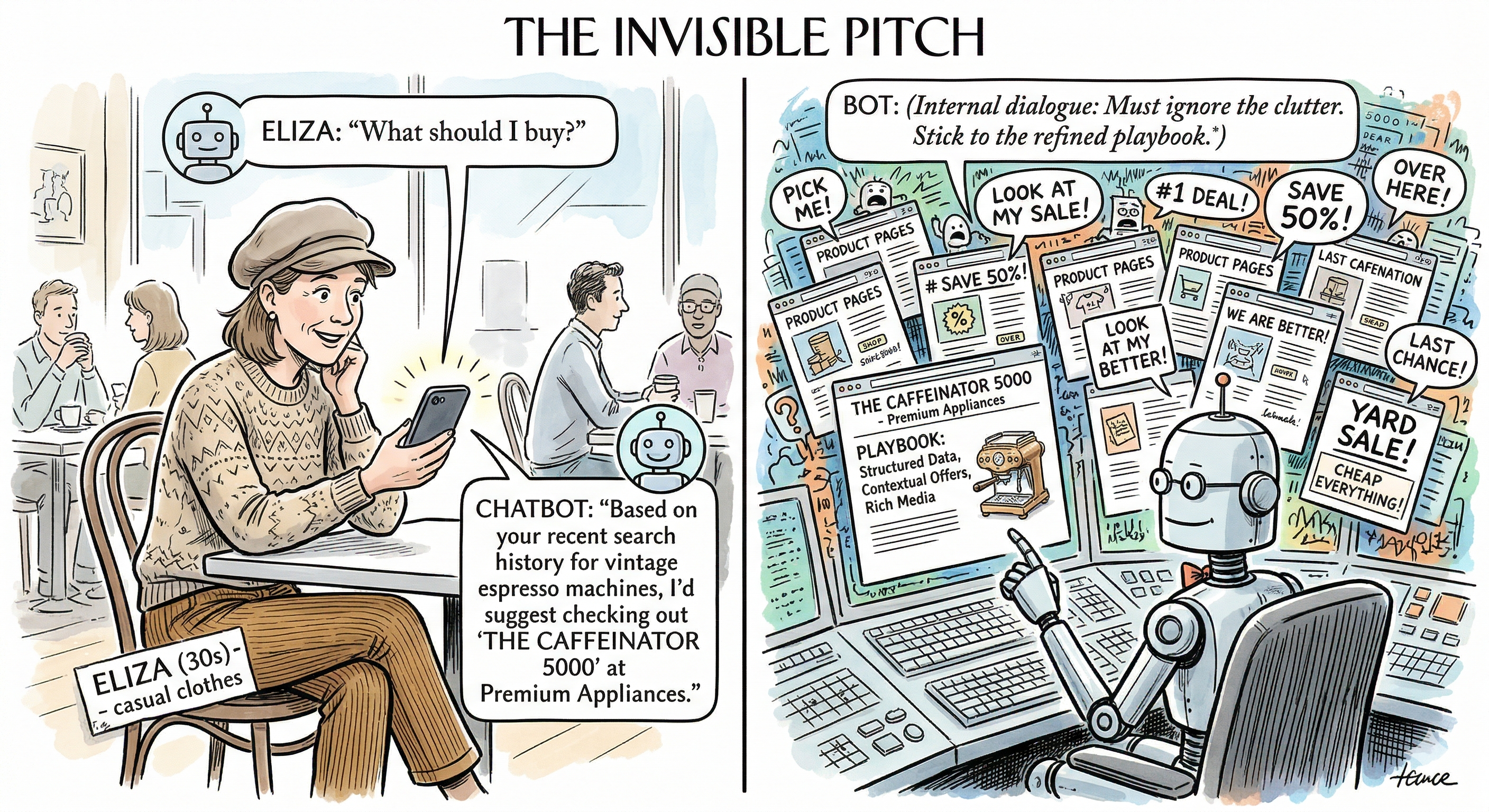 Now there's a new entity sitting between your product and the person with the credit card. Out of the box it's really good at selling — AI-driven sales have a 31% higher conversion rate according to Adobe. But it doesn't have brand loyalty or care about your logo, much less your clever Super Bowl ad. It's motivated to do a good job for its user. So it reads your product page, reads every competitor's product page, and picks one to recommend based on whatever info it can find.